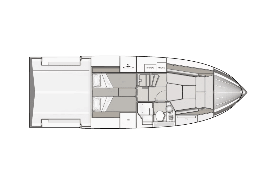 En halvtrappa ner välkomnas du av ett öppet och ljust utrymme med moderna träytor och minimalistisk design. Här njuter hela familjen i två generösa sängar, ett stort badrum med separat dusch och stora skärmar för filmkvällen. Drömmer du om en skön helg på sjön med familj eller vänner gör du det med stil och komfort i nya Gran Turismo 35!
