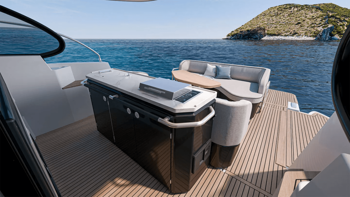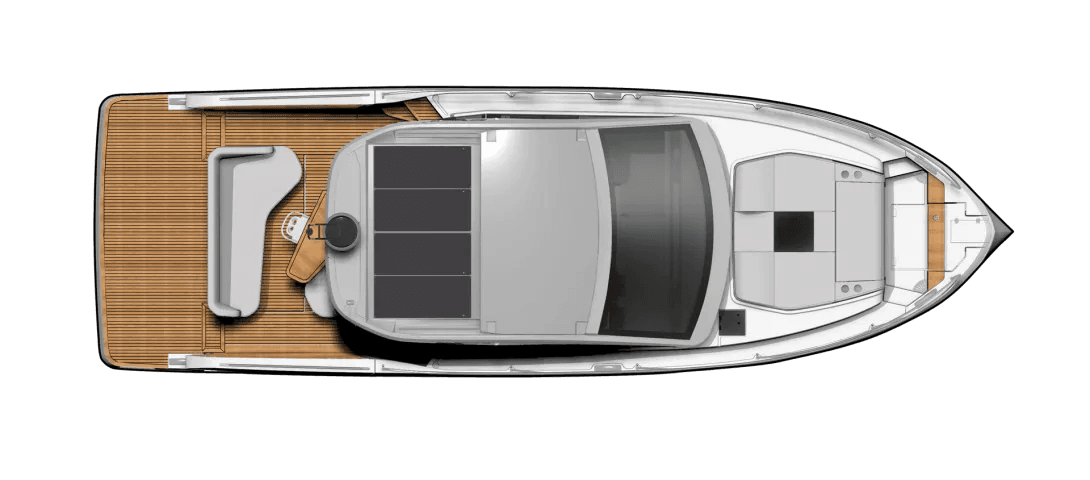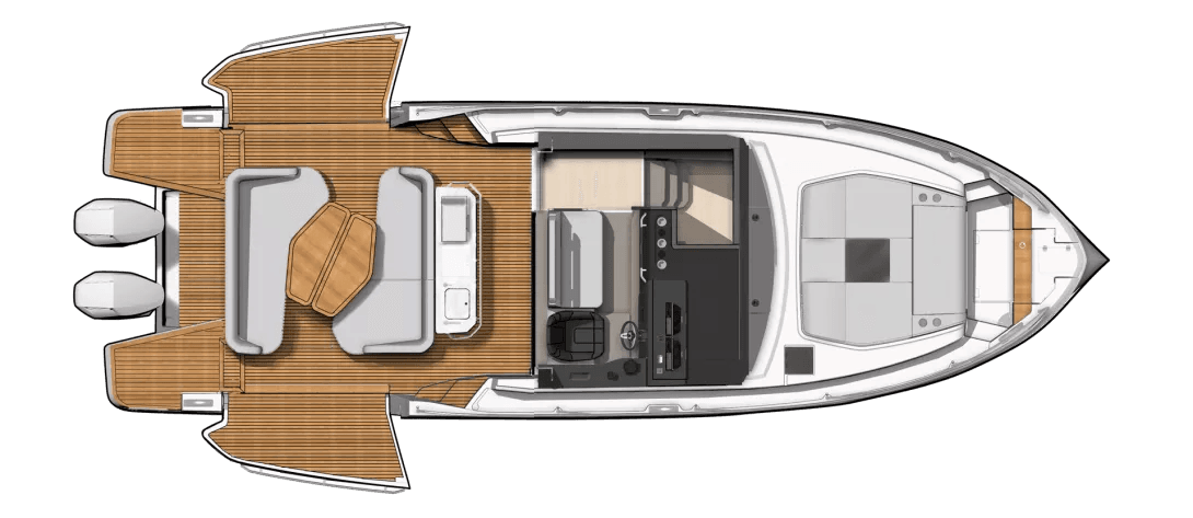 Sittbrunnen är rymlig och flexibel med U-soffa, wetbar och solytor. De fällbara badplattformarna förstärker känslan av att leva nära vattnet och gör det enkelt att bada, fiska eller bara njuta av havet. Den sportiga linjen och glasytorna ger båten en modern och kraftfull profil.