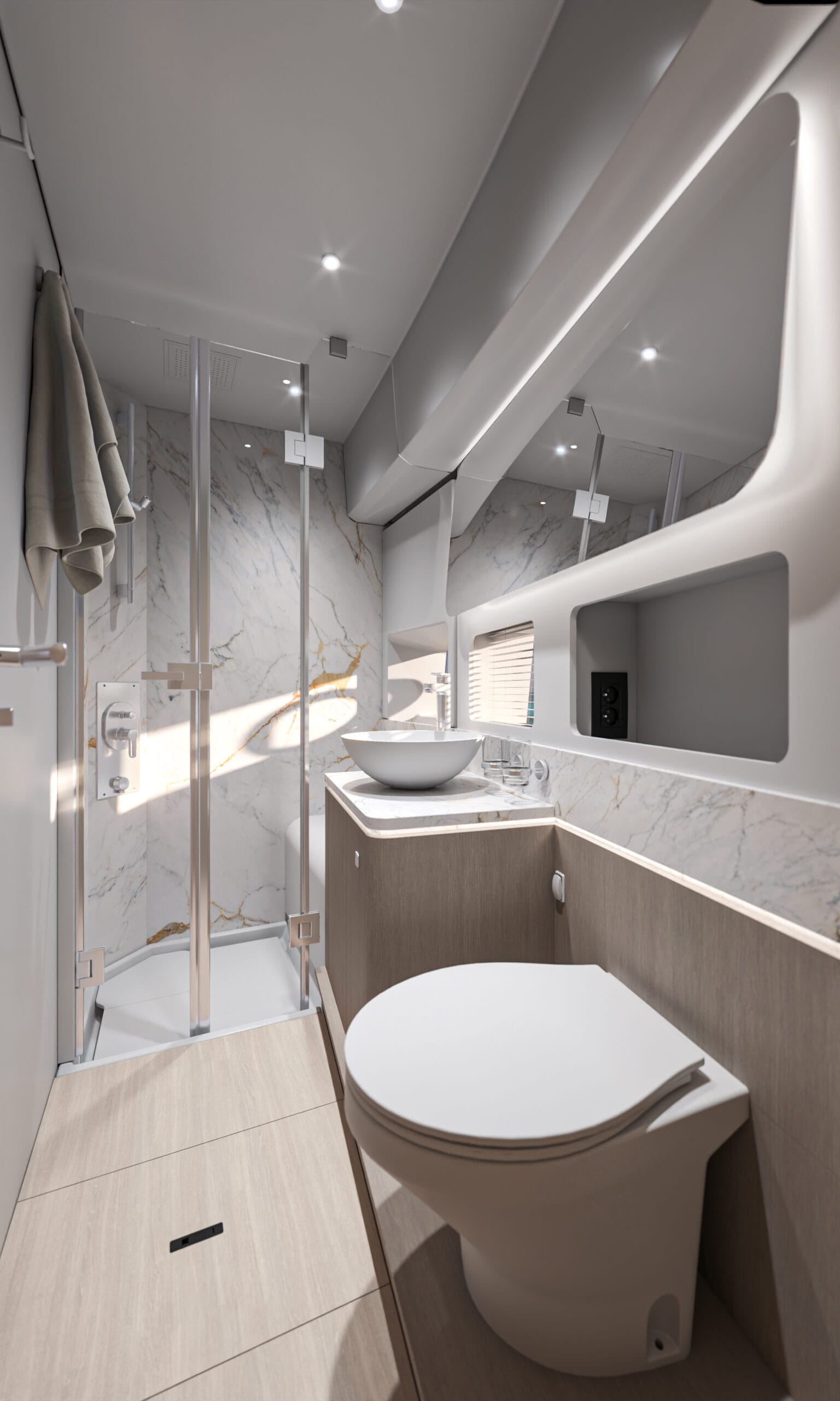 När du kliver in i Gran Turismo 50 möts du av en elegant och harmonisk miljö där varje detalj är noga genomtänkt. Ljusa färgtoner, exklusiva material och smart belysning skapar en inbjudande atmosfär som känns både modern och varm. Här finns gott om utrymme för att njuta av livet ombord – oavsett om det handlar om en helgutflykt eller längre resor.
