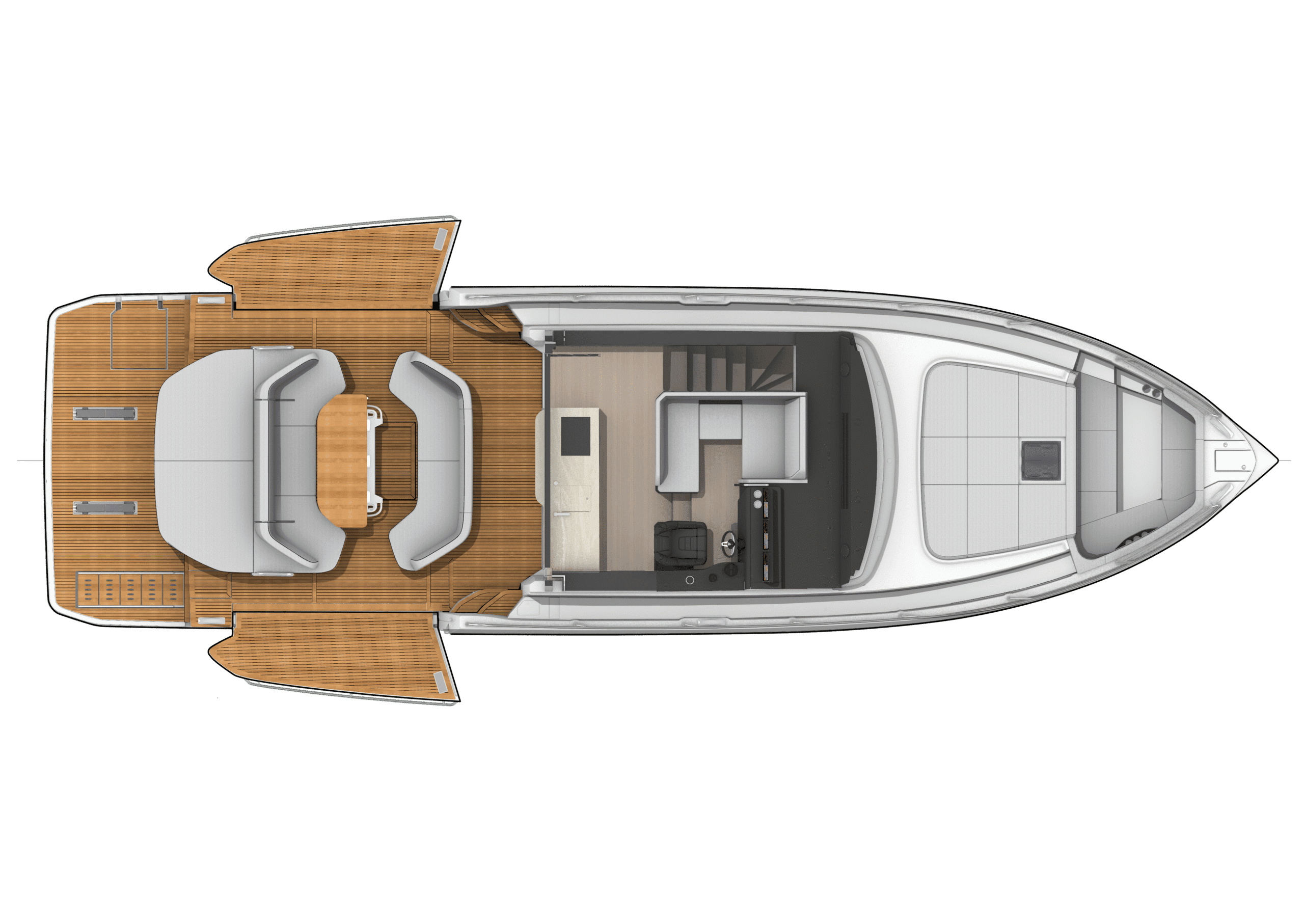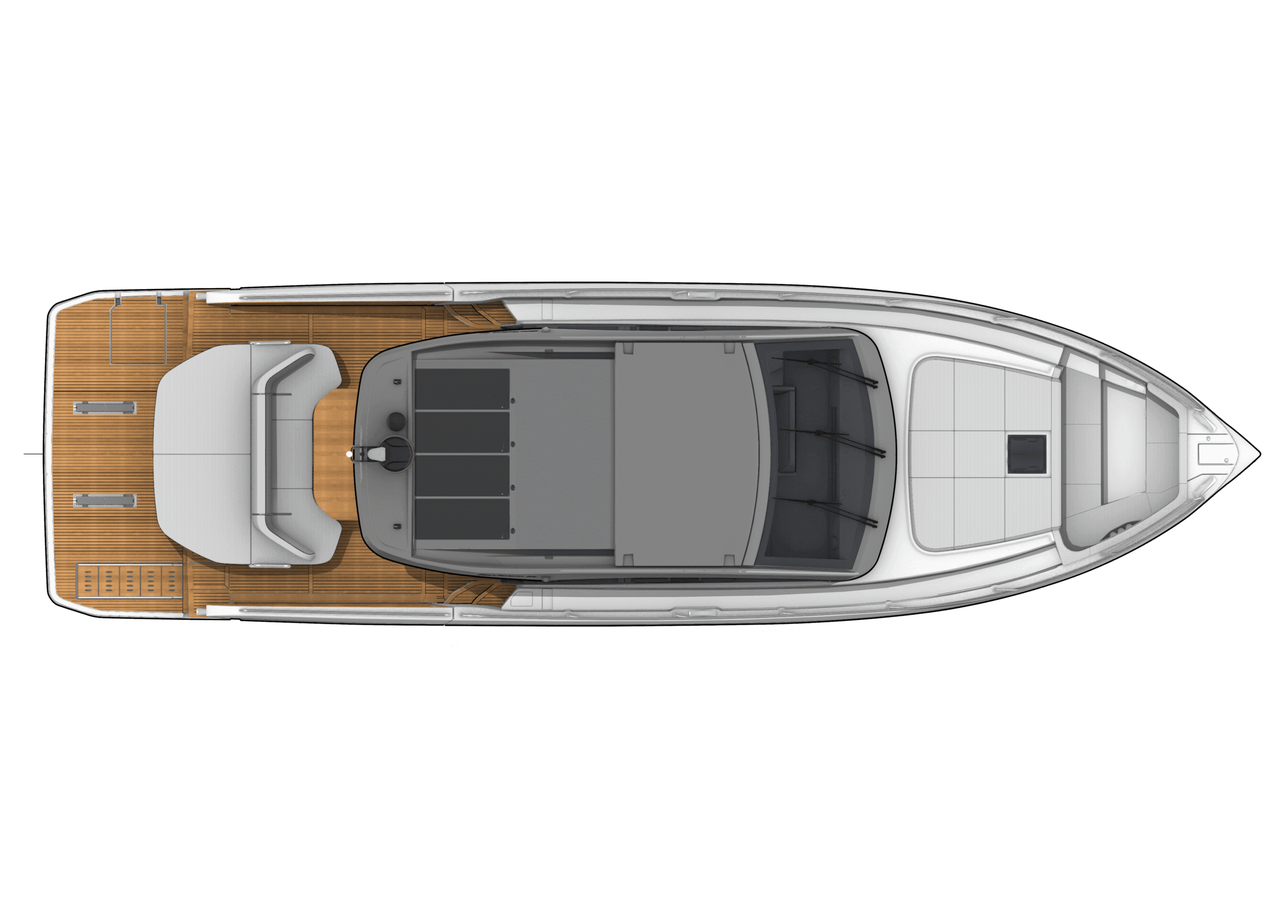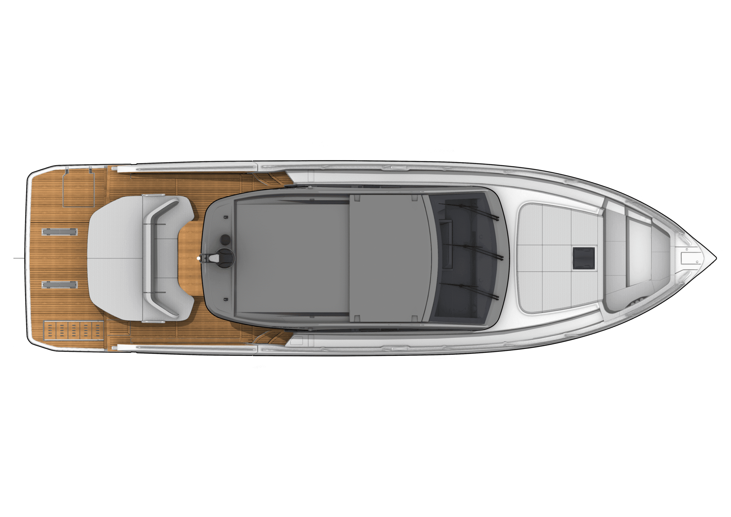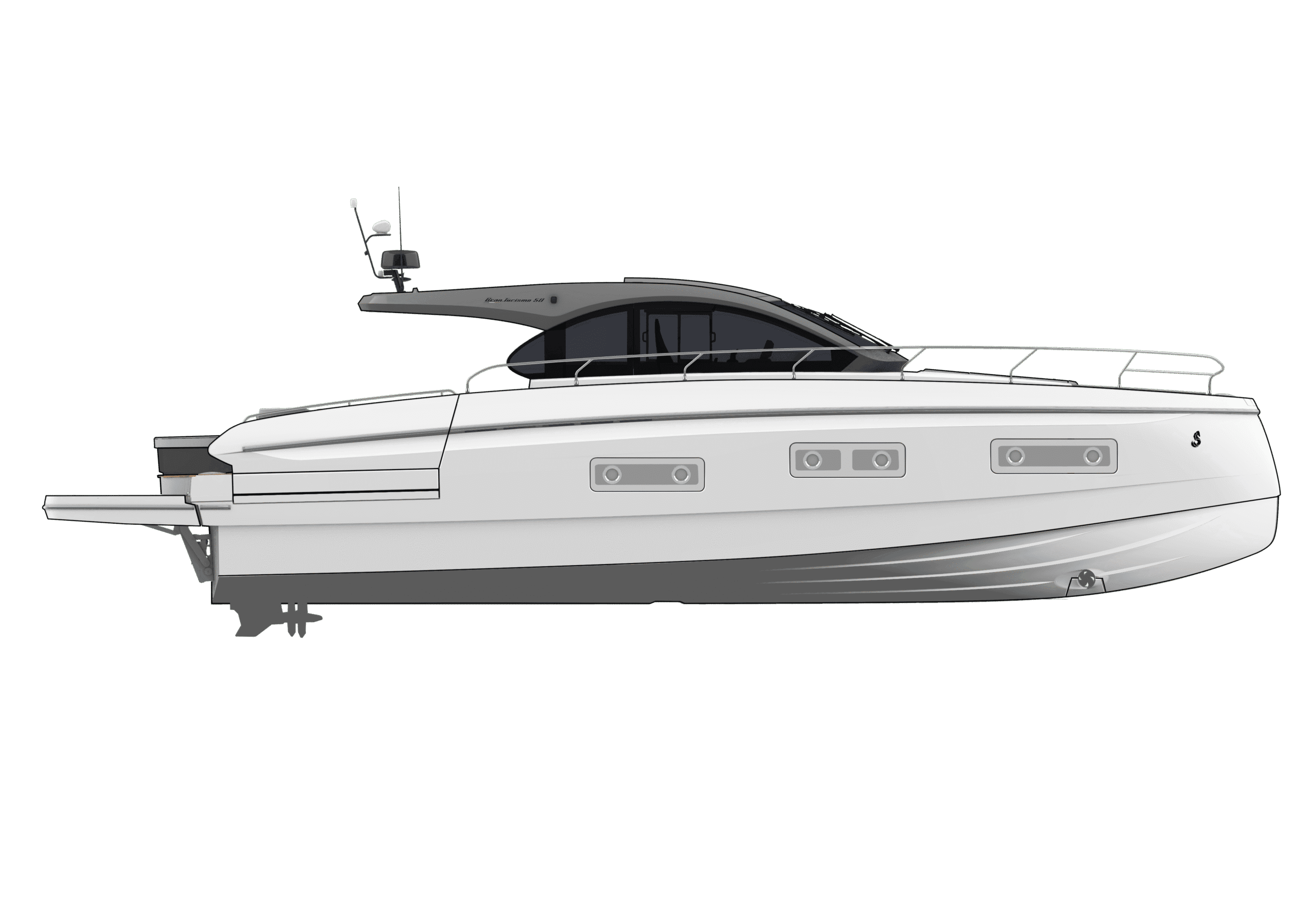Gran Turismo 50 imponerar direkt med sin dynamiska siluett och sportiga linjer som signalerar både fart och exklusivitet. Designen är skapad för att ge en naturlig koppling mellan havet och livet ombord – från den generösa badplattformen till den öppna sittbrunnen och vidare in i salongen. Här möts funktion och estetik i en layout som gör varje yta lättillgänglig och social.