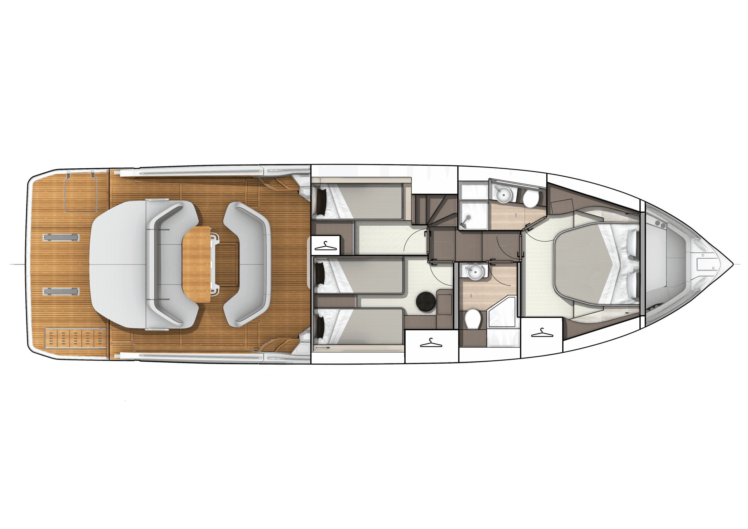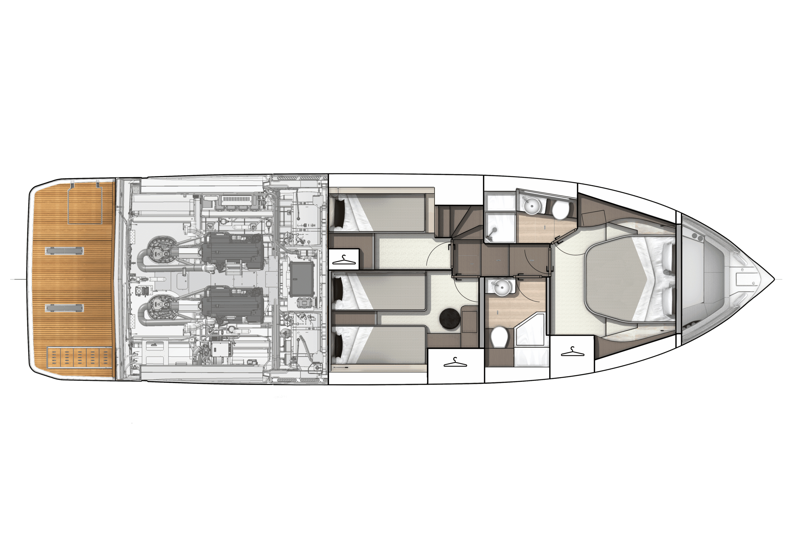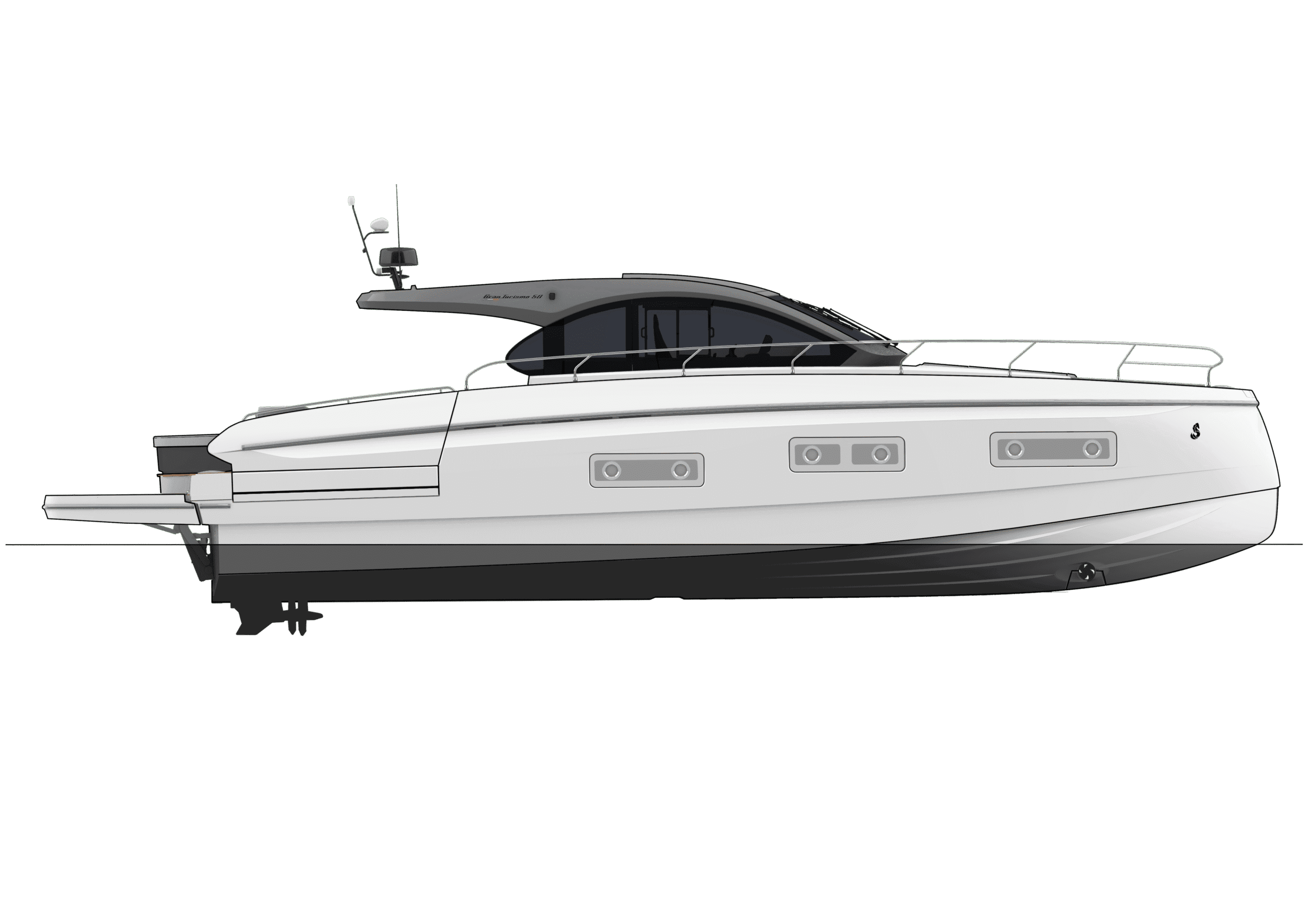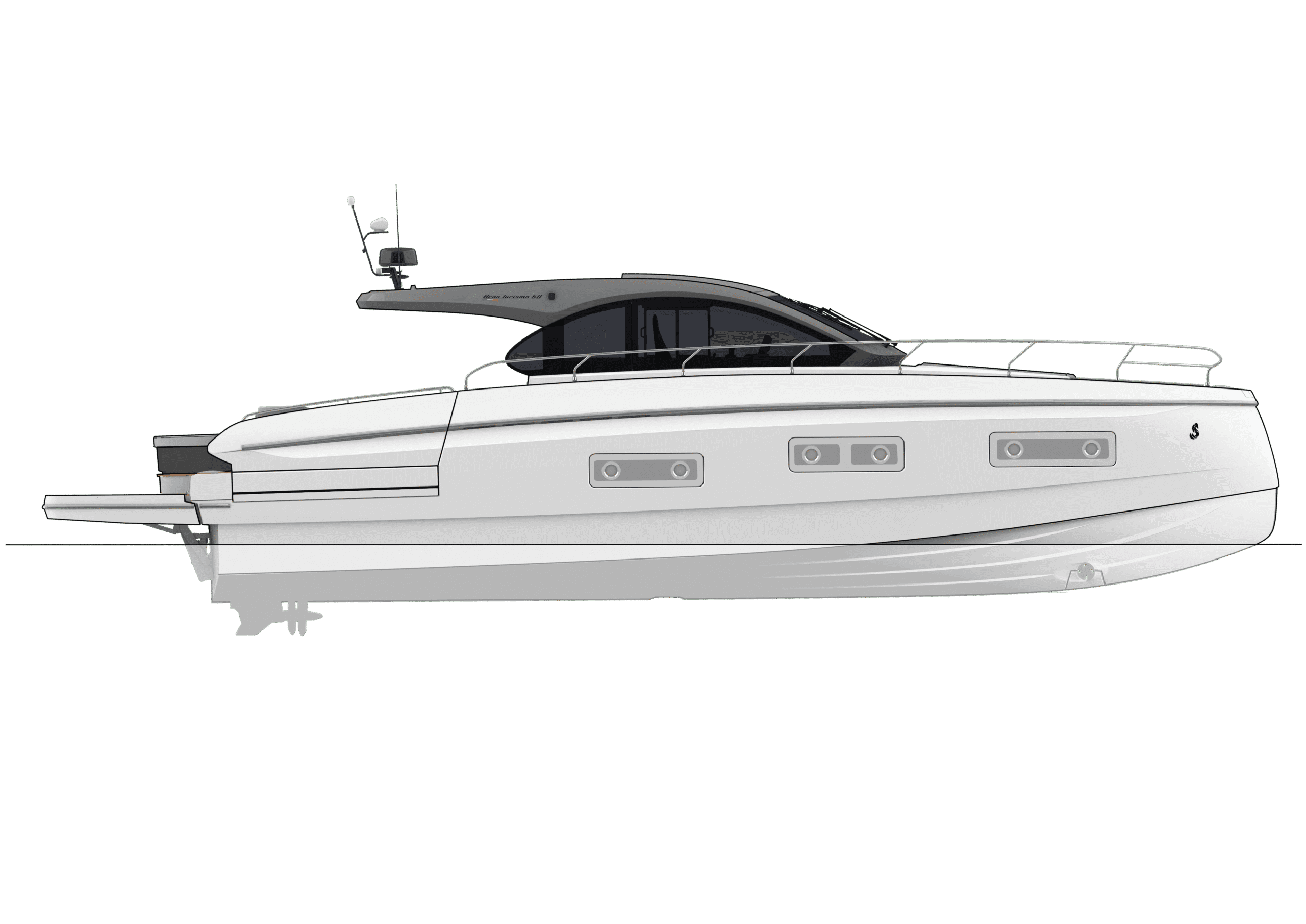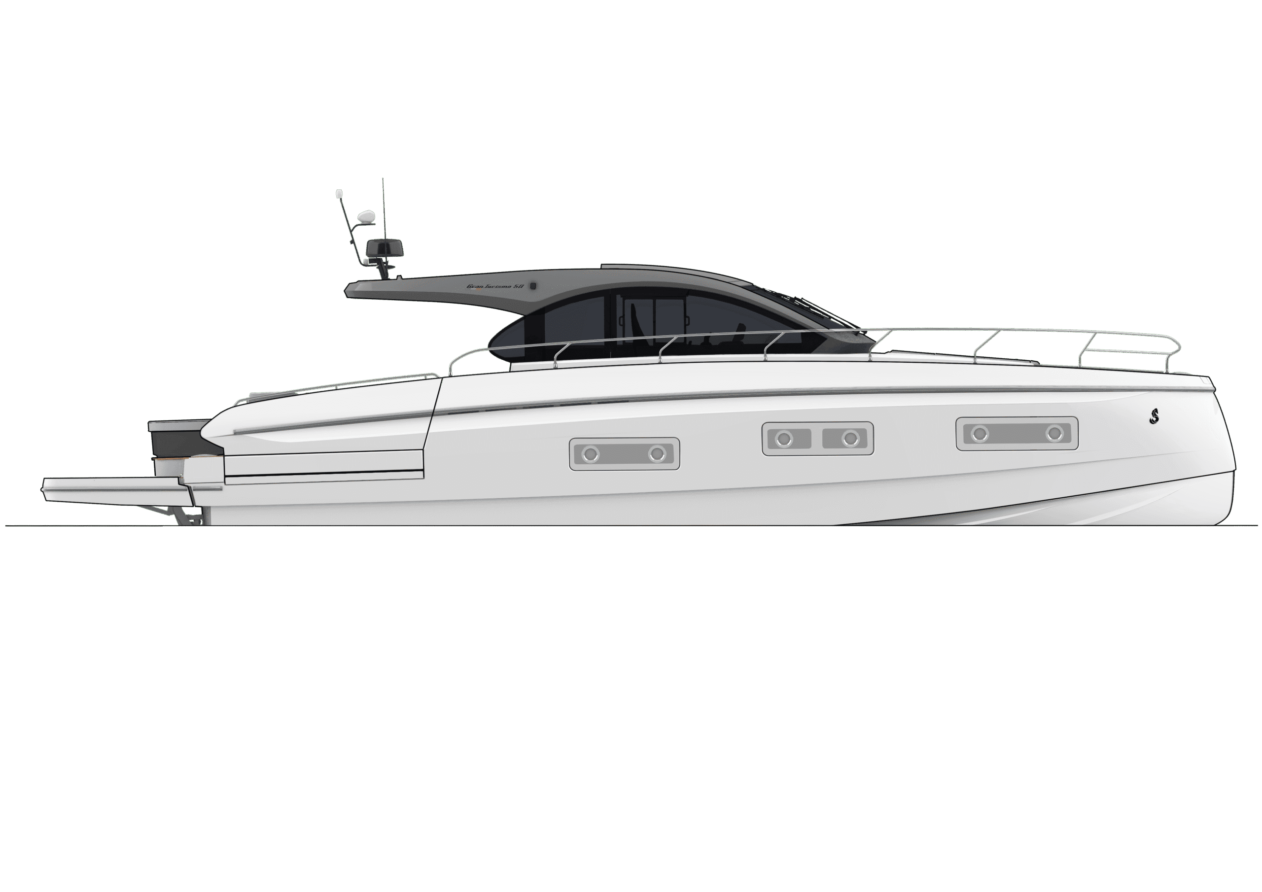 Gran Turismo 50 imponerar direkt med sin dynamiska siluett och sportiga linjer som signalerar både fart och exklusivitet. Designen är skapad för att ge en naturlig koppling mellan havet och livet ombord – från den generösa badplattformen till den öppna sittbrunnen och vidare in i salongen. Här möts funktion och estetik i en layout som gör varje yta lättillgänglig och social.