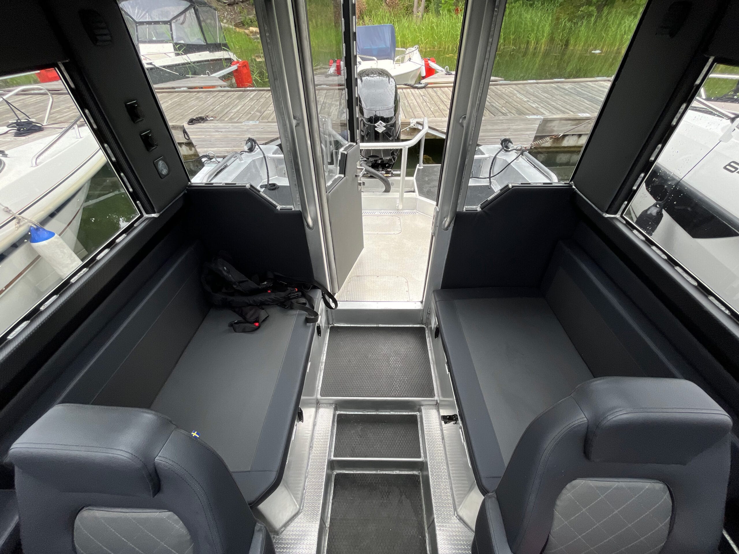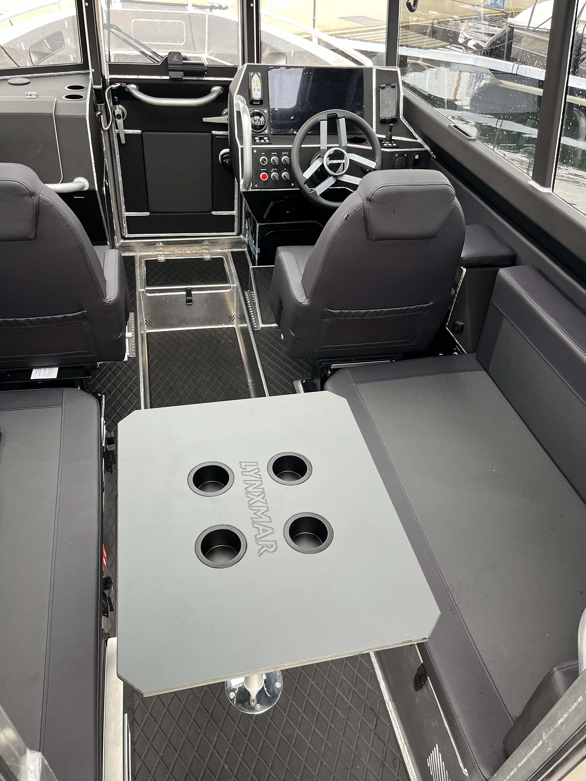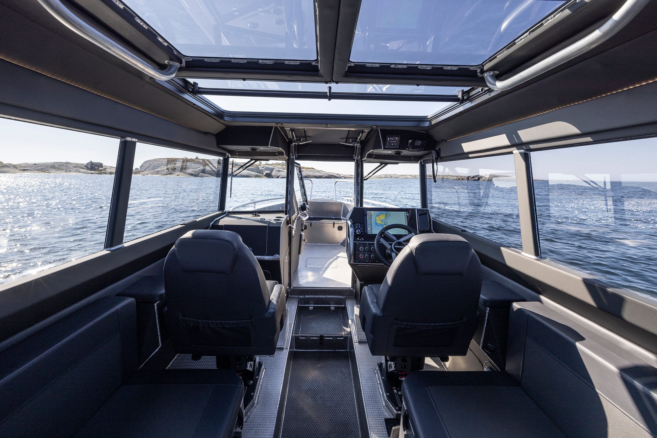 Invändigt erbjuder Lynxmar C26 en hytt som är både rymlig och välplanerad för komfort året runt. Ståhöjd på cirka 190 cm, stora glasytor och en taklucka i fullbredd skapar en ljus och luftig känsla. Förarmiljön är ergonomiskt utformad med fjädrande stolar och gott om plats för modern navigationsutrustning, inklusive en 16-tums plotter som standard. Hytten rymmer upp till åtta personer och kan utrustas med extra stolsrad för maximal flexibilitet. Materialvalen är robusta och funktionella, med halkskyddade gummimattor och ljudisolering som minimerar stomljud och resonans. För längre turer finns konverterbar soffa med kojmöjlighet, värmare på 4 kW och gott om stuvutrymmen – allt för att skapa en trygg och bekväm miljö även under kalla dagar.