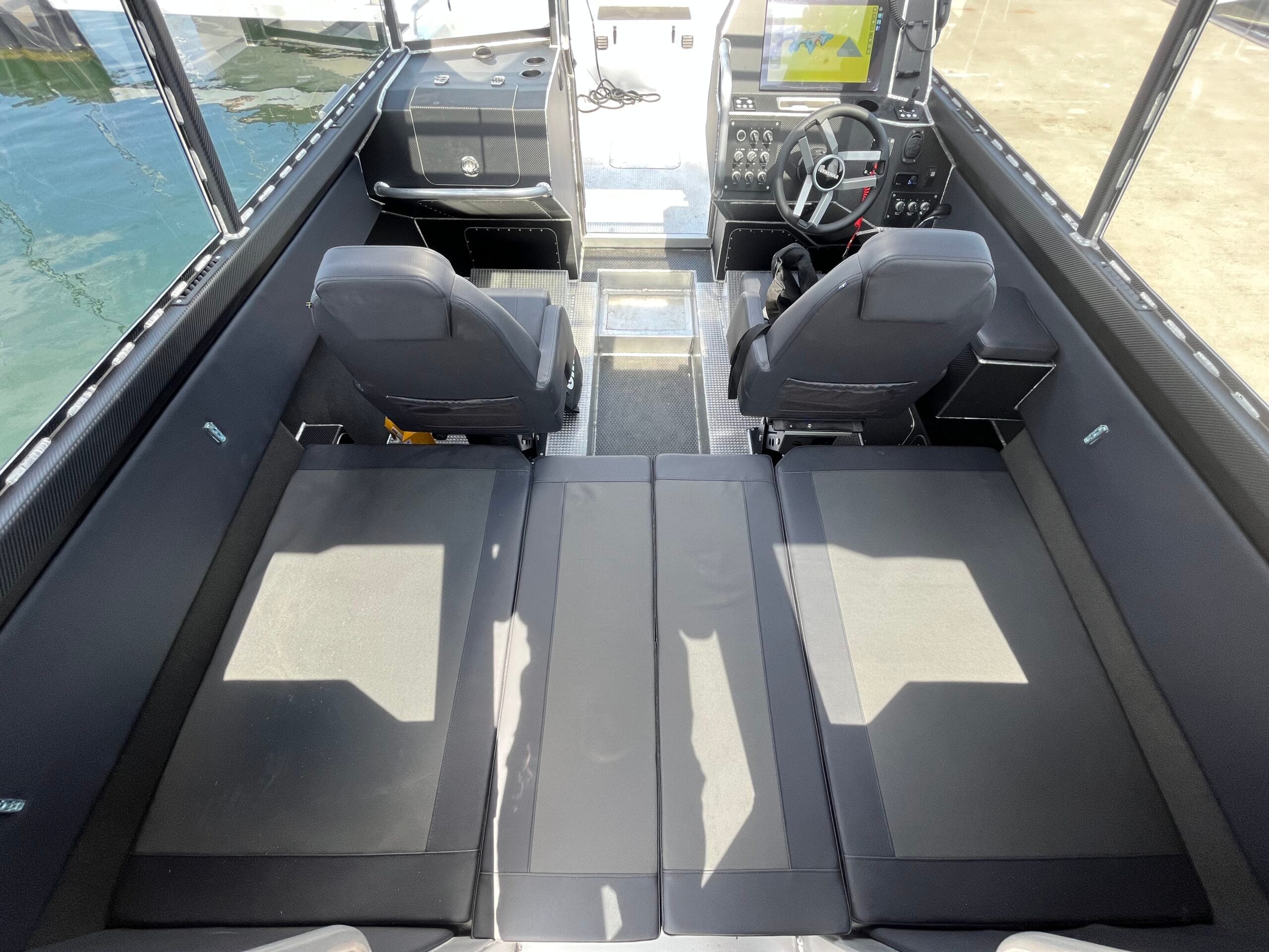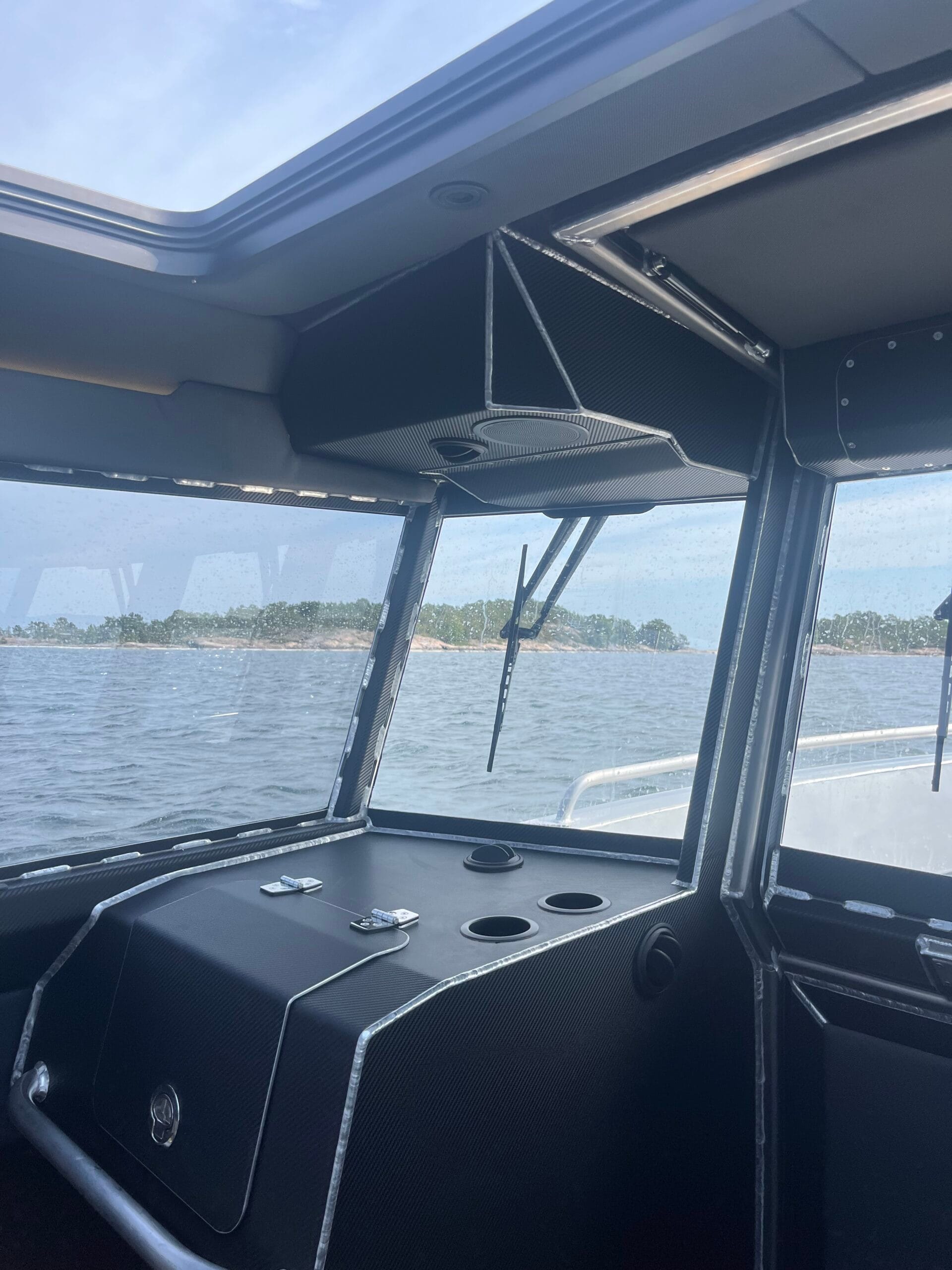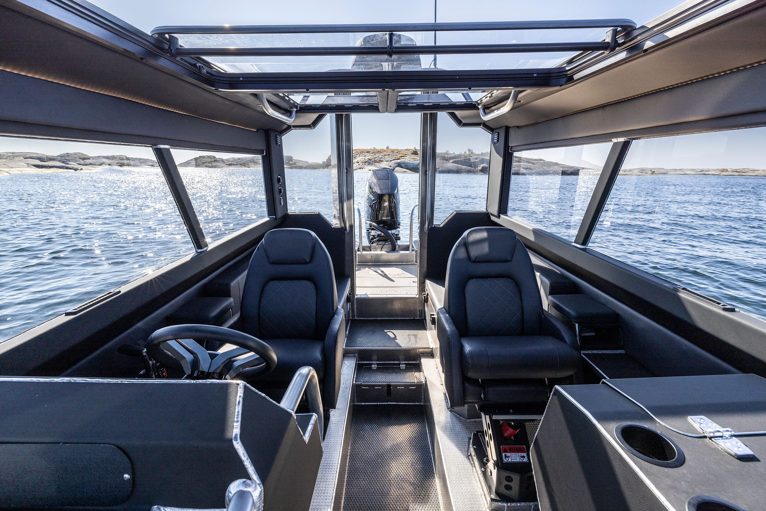 Invändigt erbjuder Lynxmar C26 en hytt som är både rymlig och välplanerad för komfort året runt. Ståhöjd på cirka 190 cm, stora glasytor och en taklucka i fullbredd skapar en ljus och luftig känsla. Förarmiljön är ergonomiskt utformad med fjädrande stolar och gott om plats för modern navigationsutrustning, inklusive en 16-tums plotter som standard. Hytten rymmer upp till åtta personer och kan utrustas med extra stolsrad för maximal flexibilitet. Materialvalen är robusta och funktionella, med halkskyddade gummimattor och ljudisolering som minimerar stomljud och resonans. För längre turer finns konverterbar soffa med kojmöjlighet, värmare på 4 kW och gott om stuvutrymmen – allt för att skapa en trygg och bekväm miljö även under kalla dagar.