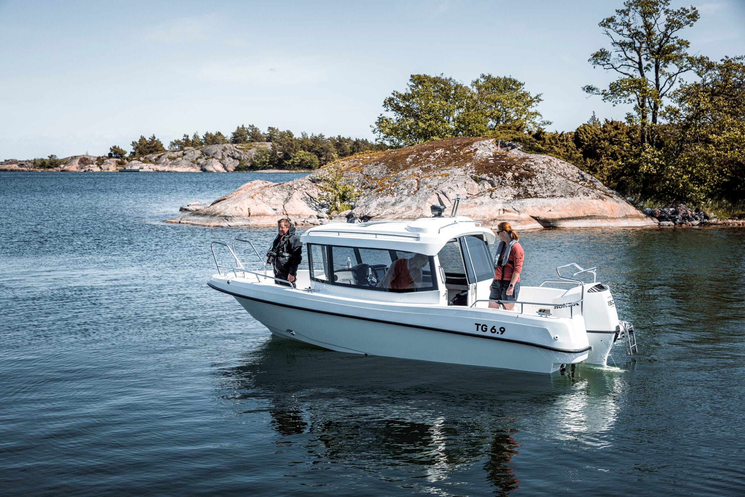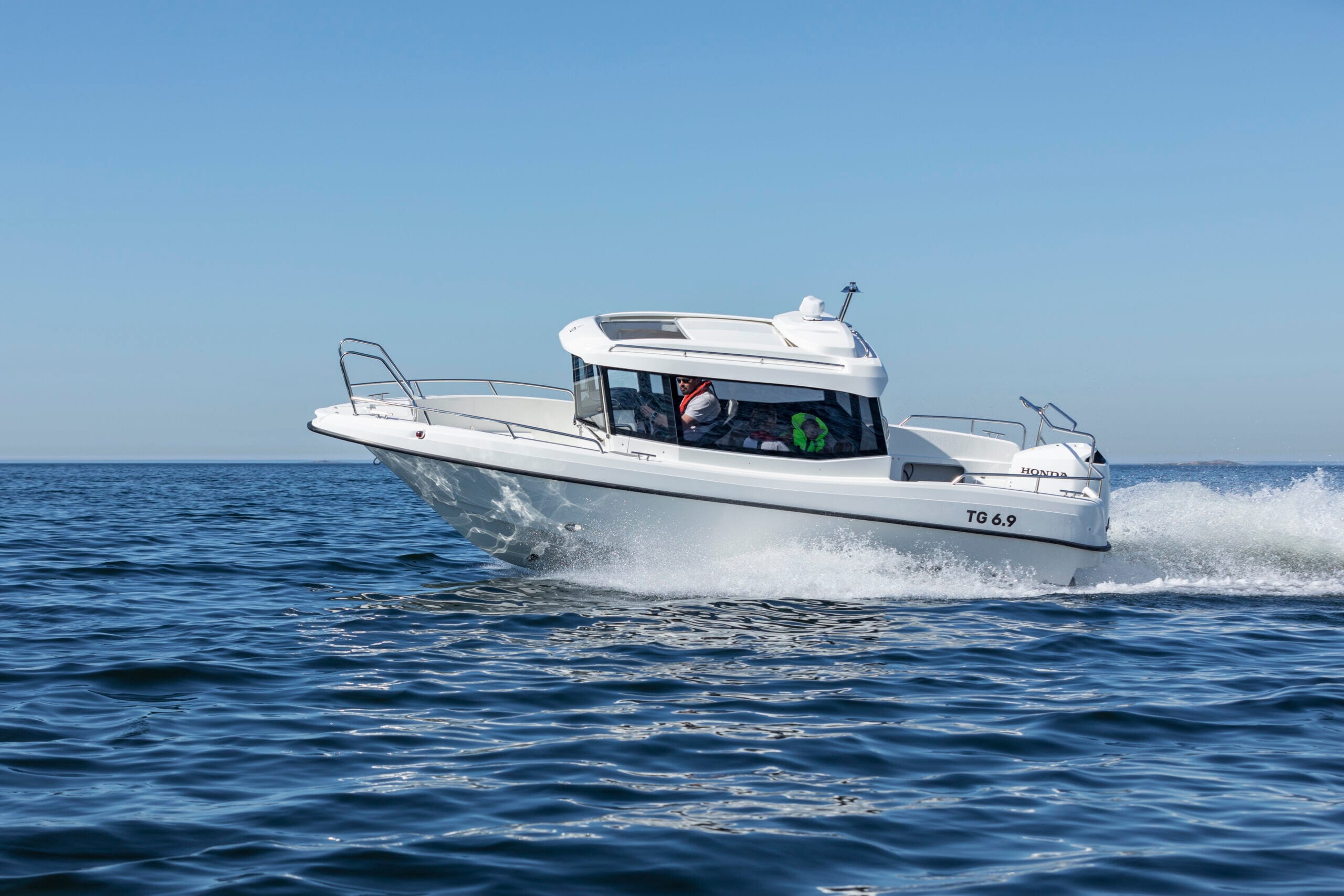 TG 6.9 är en hyttbåt som kombinerar komfort, säkerhet och mångsidighet. Med plats för övernattning, skydd mot väder och en rymlig sittbrunn är den idealisk för både familjeutflykter och pendling i skärgården.