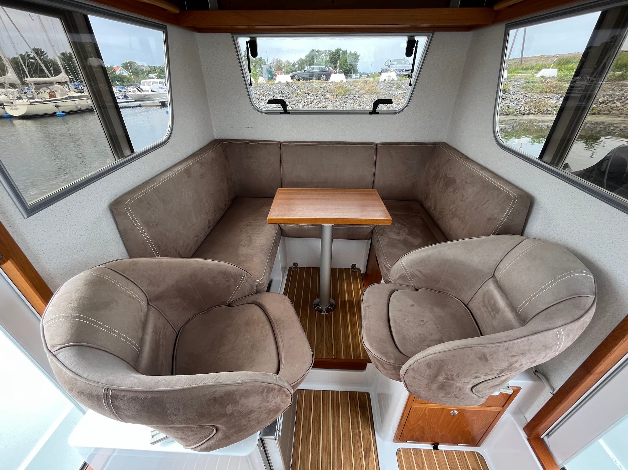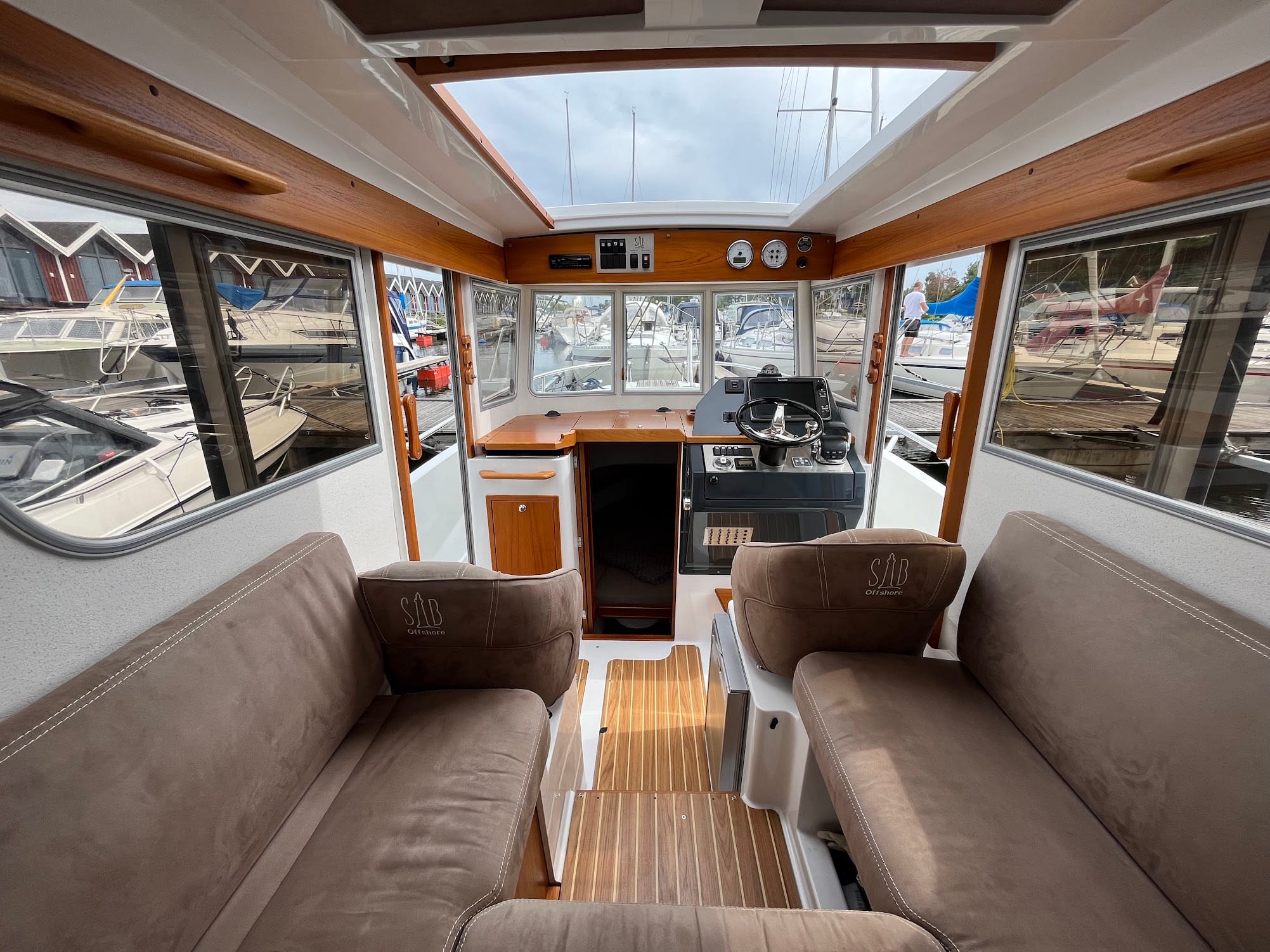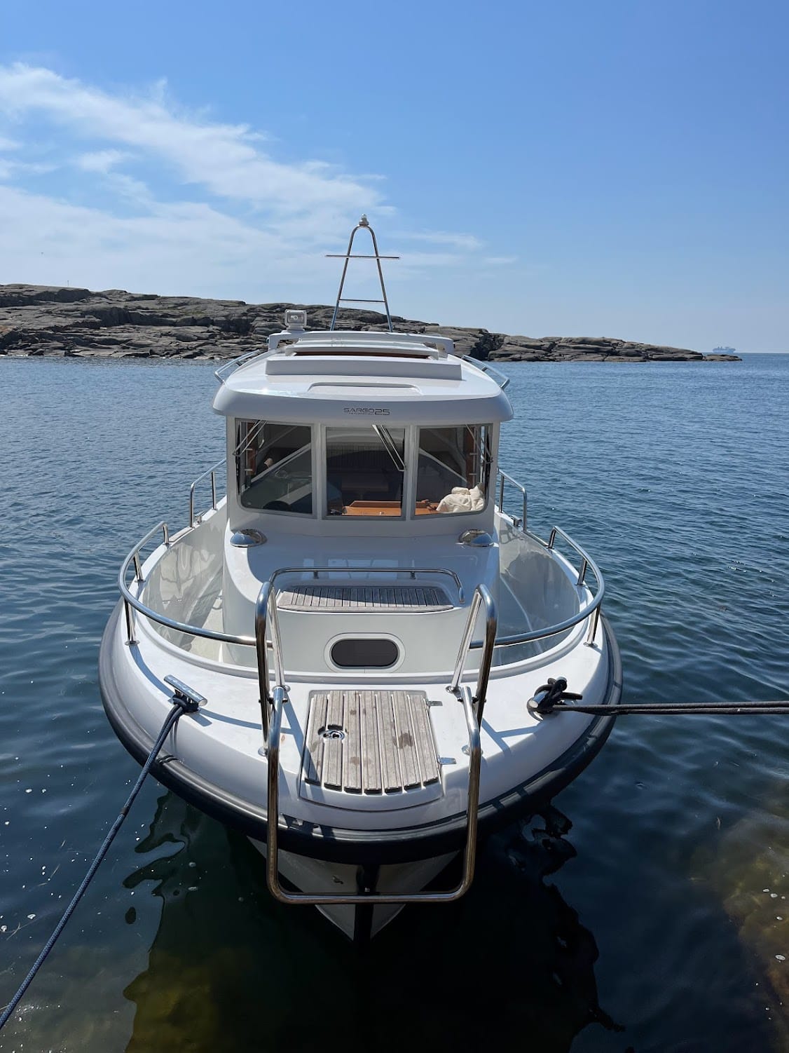 Vi gillar hur lätt det är att röra sig både i hytten och ute på akterdäck/skarndäck samt de stora förvaringsutrymmena under durken. Vi älskar hur bekvämt man färdas i sköna stolar och tyst väderskyddad kabin. Varma sommardagar öppnar man skjutdörrarna, taket och akterfönstret för att effektivt ventilera hytten. Denna båt har den stora bädden i dess utförande! Båten har en ägare och är årligen noga servad och inomhusförvarad på varv.