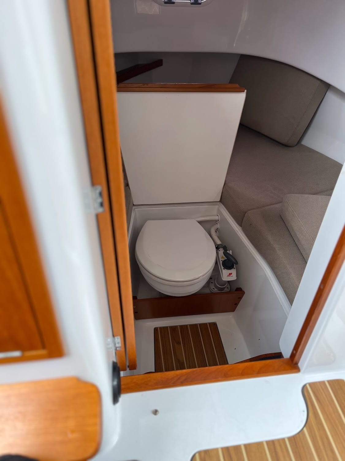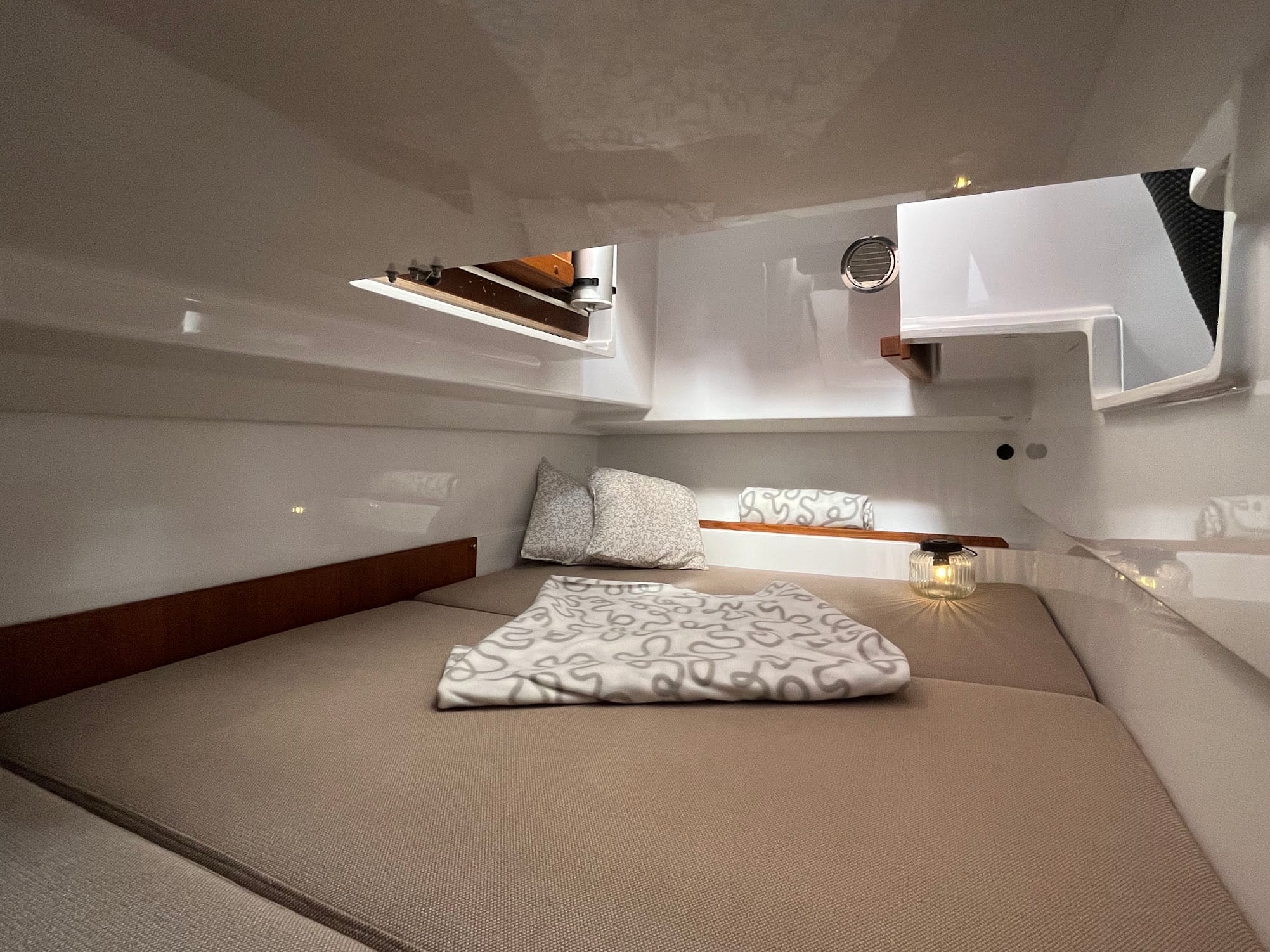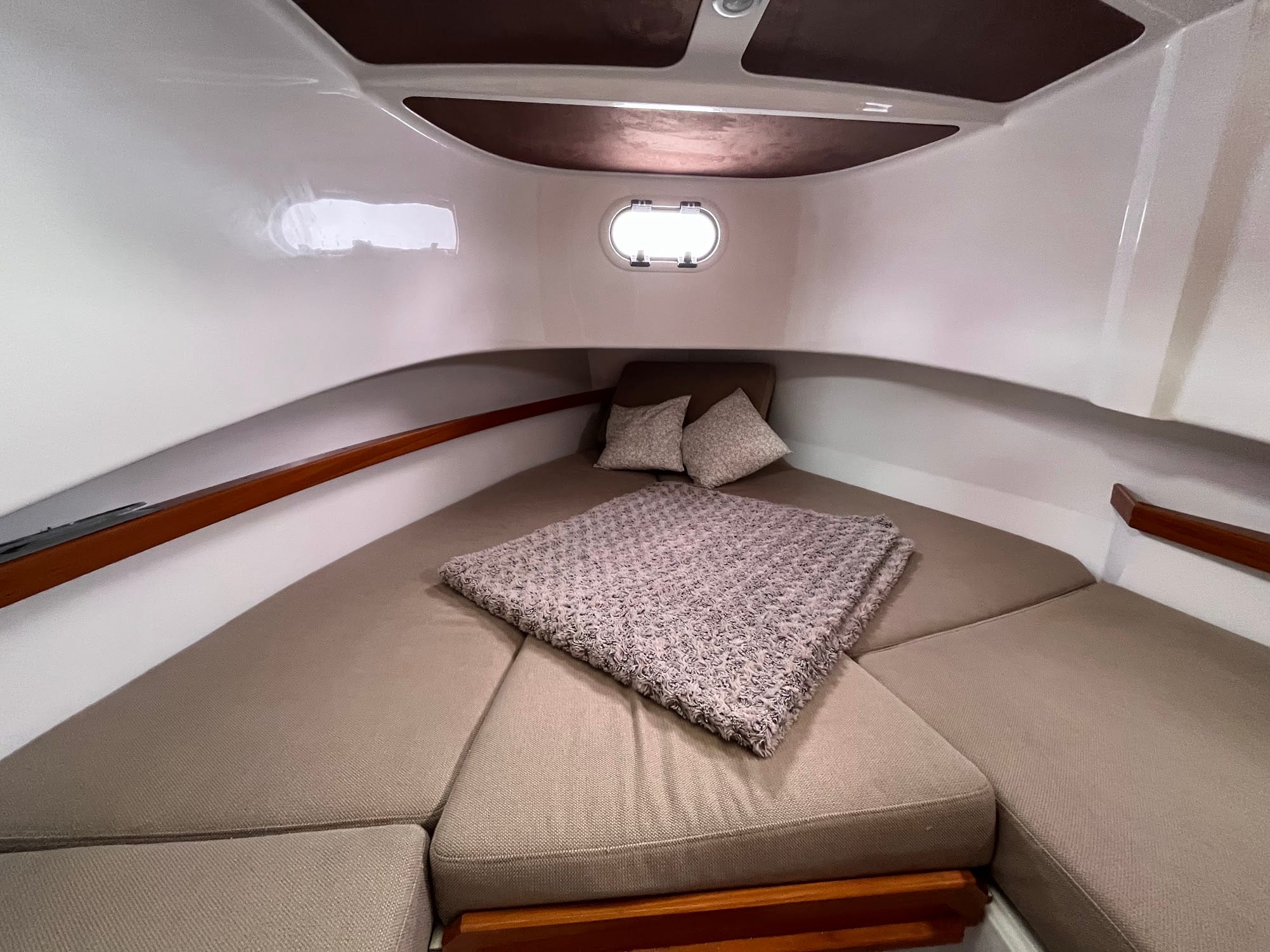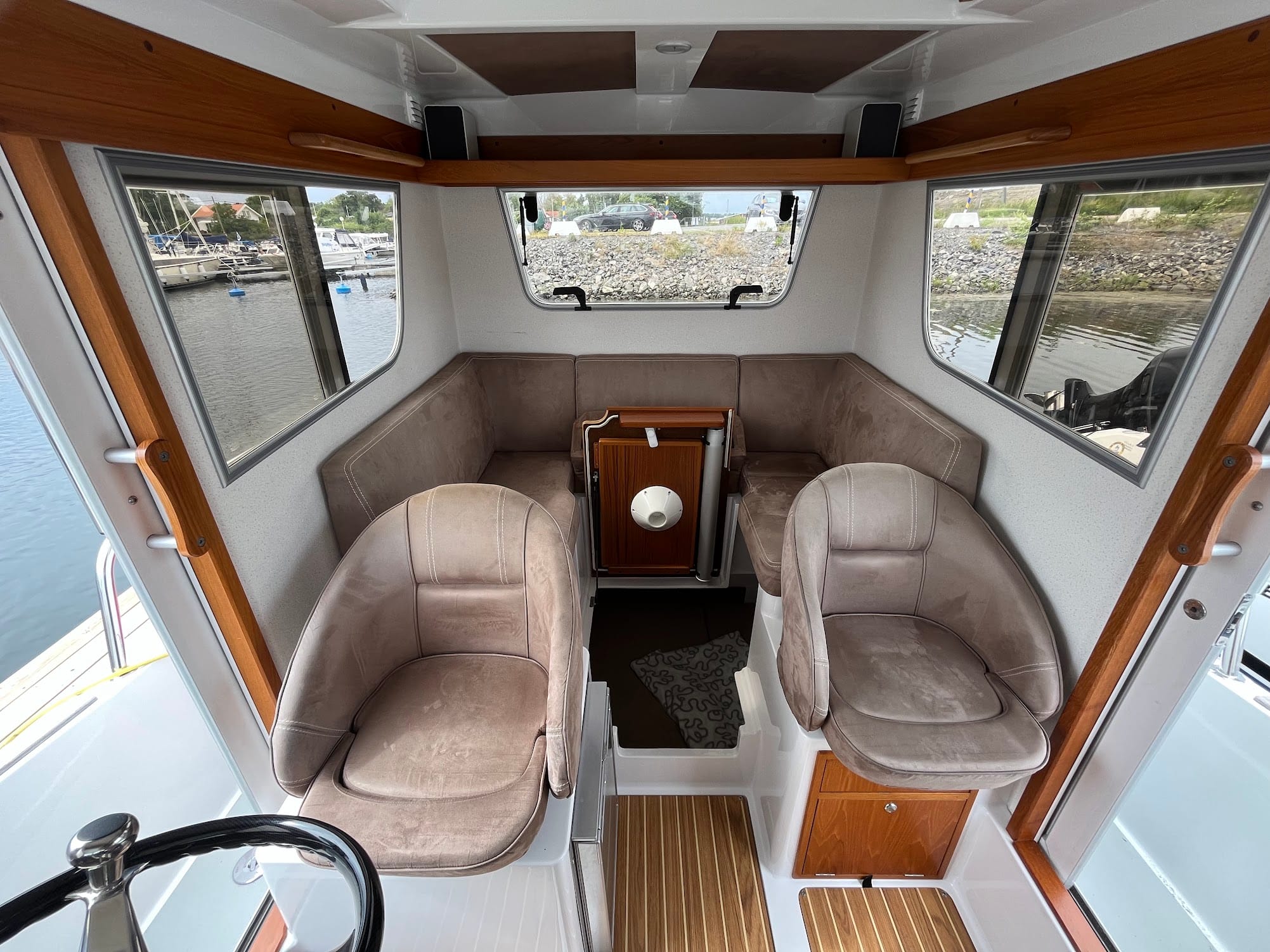 Vi gillar hur lätt det är att röra sig både i hytten och ute på akterdäck/skarndäck samt de stora förvaringsutrymmena under durken. Vi älskar hur bekvämt man färdas i sköna stolar och tyst väderskyddad kabin. Varma sommardagar öppnar man skjutdörrarna, taket och akterfönstret för att effektivt ventilera hytten. Denna båt har den stora bädden i dess utförande! Båten har en ägare och är årligen noga servad och inomhusförvarad på varv.