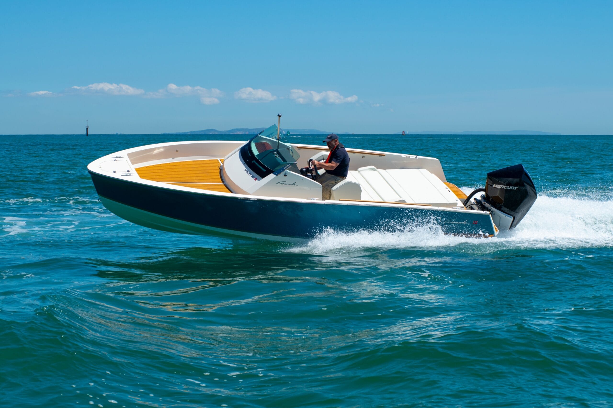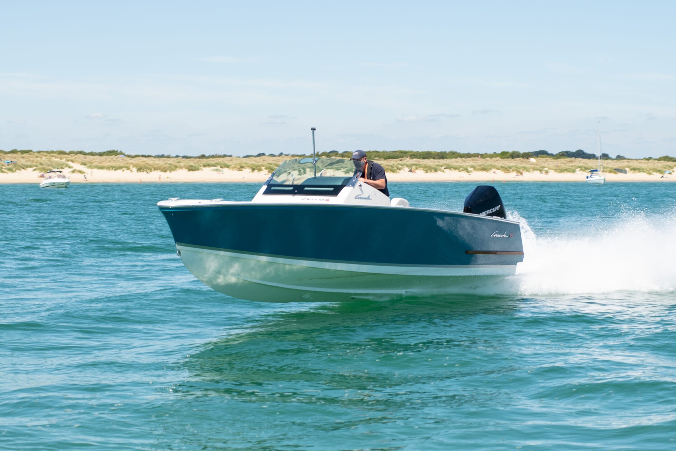 Cormate Utility är liten i formatet men känns stor och trygg på vattnet. Kliv ombord på den vackra badbryggan i aktern där vi också hittar en integrerad badstege. Passera förbi soffan som med ett handgrepp görs om till en stor solbädd och sjunk ner i den skålade förarstolen. Aktivera vippströmbrytarna i panelen och starta upp motorn med CoastKey fjärrkontroll runt halsen. Att lätta förtöjningarna och slå i växeln med Mercury Zero Effort racing reglage i aluminium bidrar till det oförglömliga DNA som Cormate andas i varje detalj.