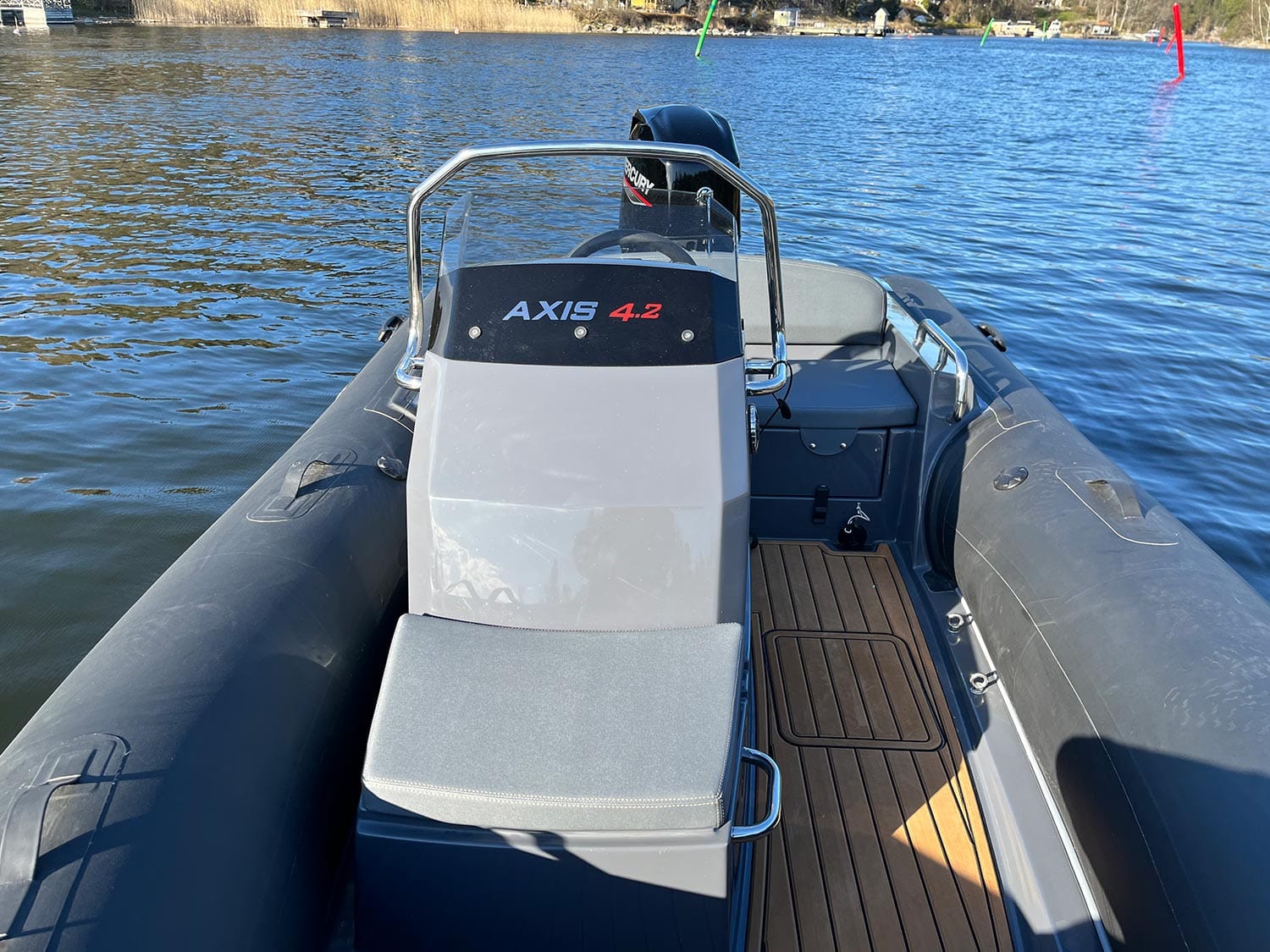 Axis 4,2 är fantastiskt rymlig och lätt att röra sig i med sittplatser både bak, framför styrkonsollen och längst fram. Genomgående hög kvalitet, lyxig känsla med EVA durken och smarta detaljer gör Axis 4,2 till en riktig favorit! Båten är rikligt utrustad med bland annat EVA durk, LED beslysning, grabbräcke i rostfritt, hypalon tuber, bottenfärg och komplett förtöjningspaket. Ordinarie pris på denna båt är 4695 kr / mån.